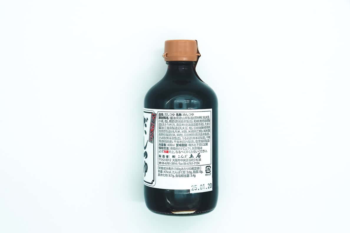 Ingrédients: Sauce soja de Wakayama (soja entière, blé, sel), flocon de bonite séchée de Kagoshima, sucre brut de canne de Kagoshima, Ma Konbu de la ville de Hakodate Hokkaido, Sauce soja Tamari de Mie (Soja entière, sel), mirin traditionnel de la région Kamo de Gifu (riz gluant, koji du riz, shochu de riz), saké junmai de Nagano (riz, koji du riz), flocon de bonite Souda de Kagoshima, flocon de maquereau de Kumamoto, sardine Urume de Kumamoto, Shiitaké séché de Shizuoka, crevettes séchées du Japon, Sel d’Ehime