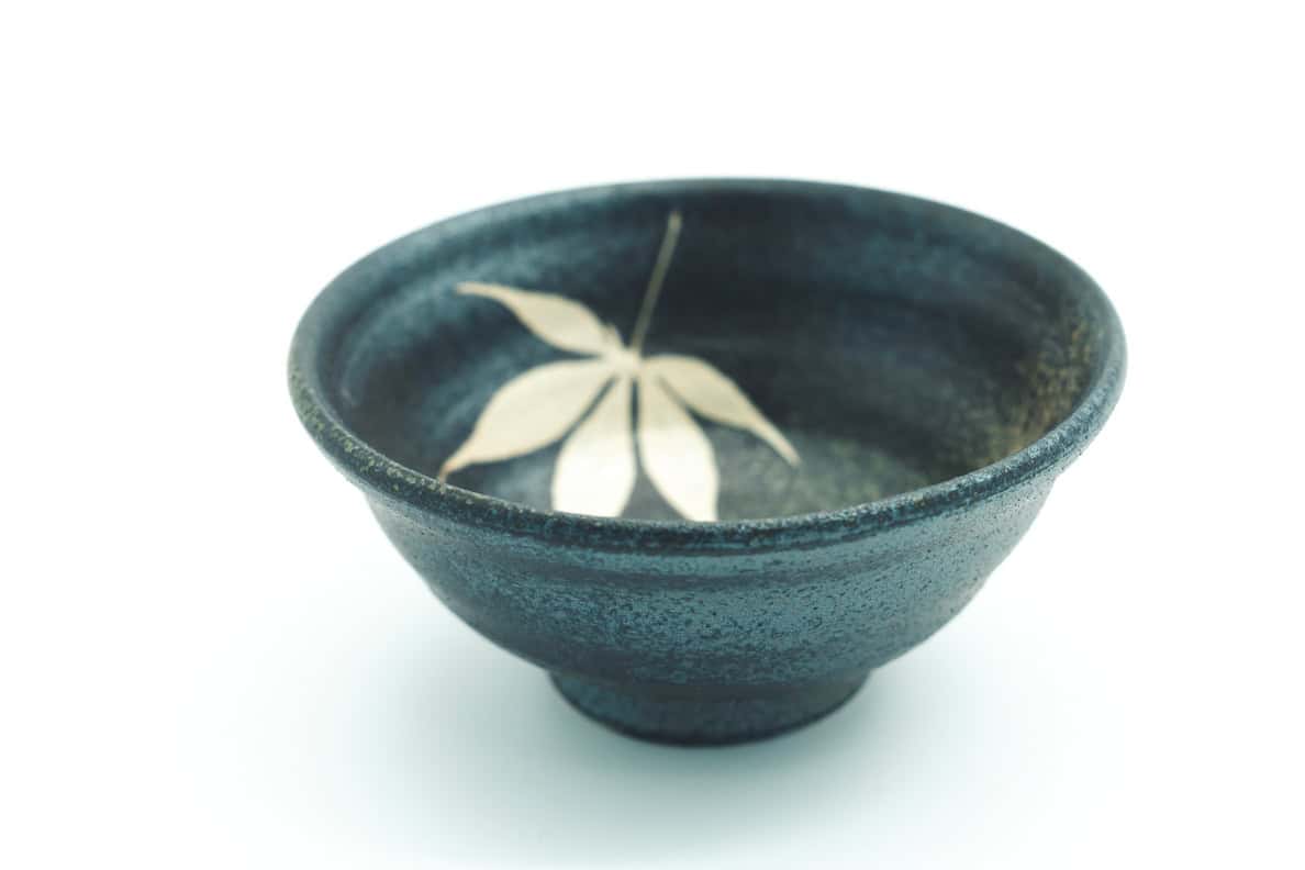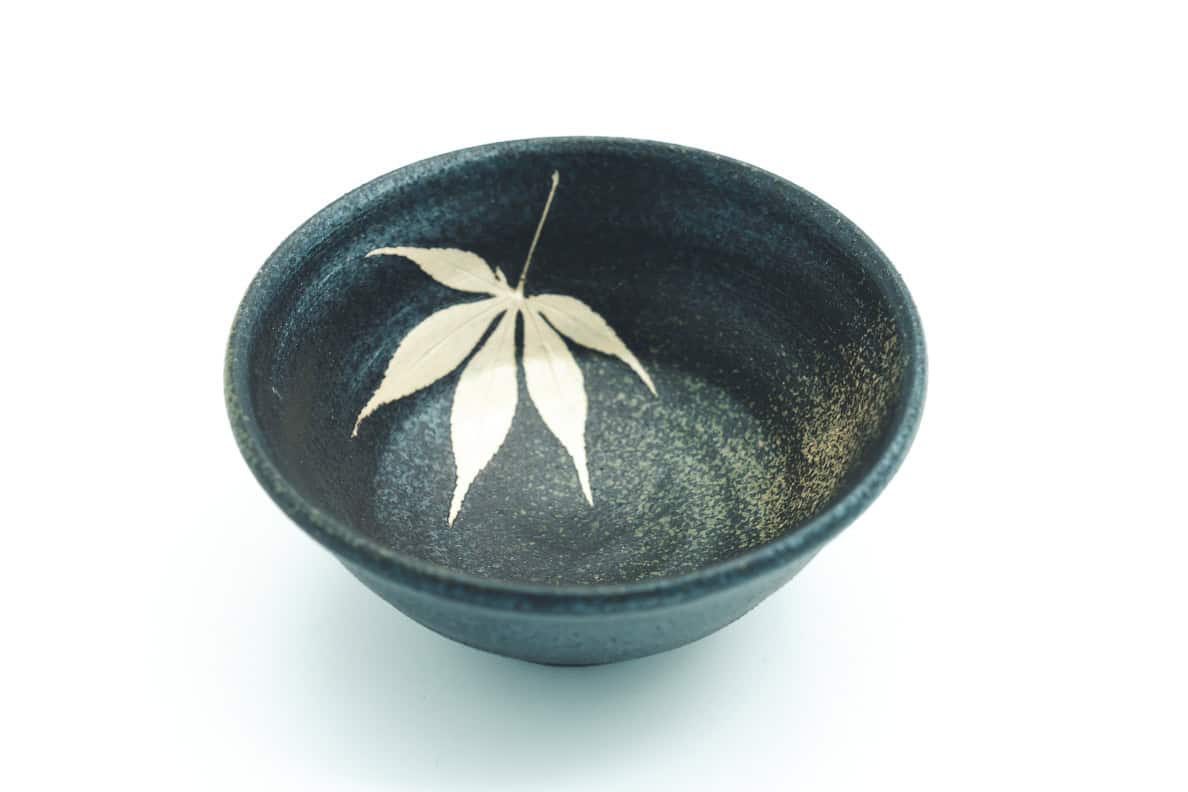 Elle est décorée avec des feuilles d’érable cueillies dans le jardin de l’atelier Tsuganoyaki, ce qui rend chaque pièce unique. La douce teinte noire de l’émail est une couleur transmise dans l’atelier depuis plus de 30 ans.