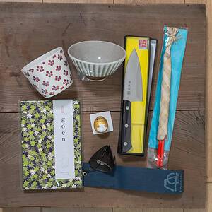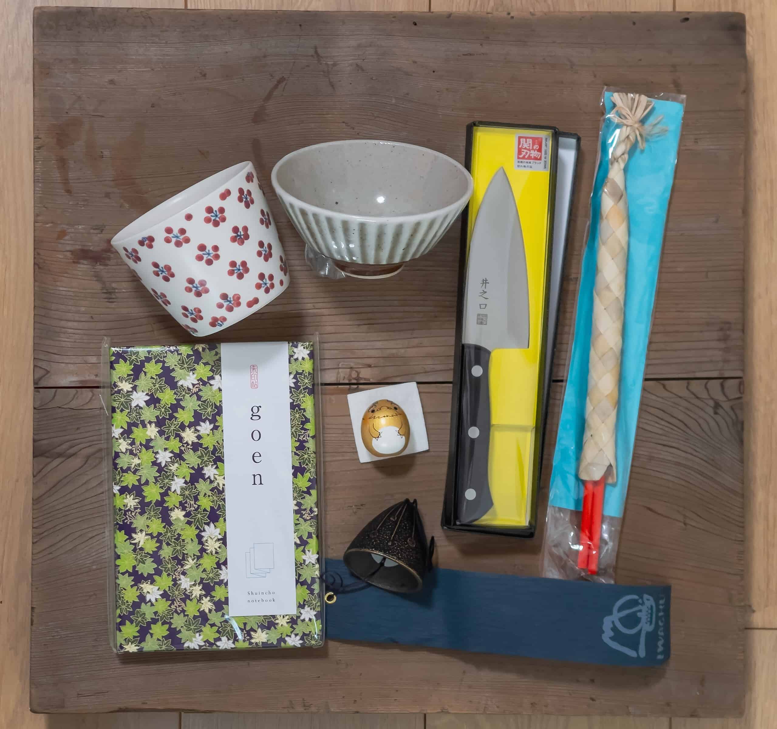 1 bol à soba, 1 bol à riz, 1 carnet à Calligraphie Goshuincho, 1 poupée Kokeshi, 1 couteau japonais, 1 paire de baguettes traditionnelles d’Okinawa et 1 véritable Furin.