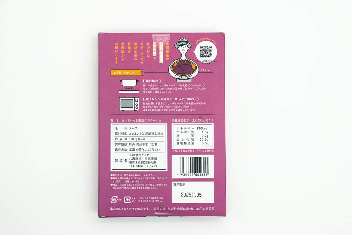 Ce potage est une pâte préparée uniquement avec du koji produit localement et des patates douces récoltées dans les propres fermes de l’entreprise. Les patates douces sont soigneusement maturées après la récolte pour intensifier leur douceur et leur saveur.