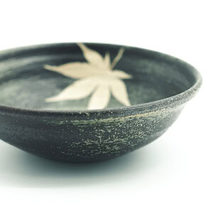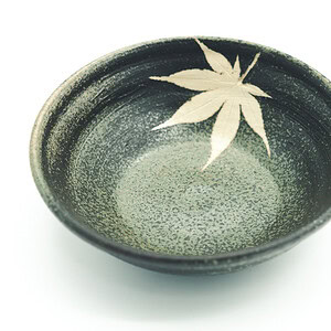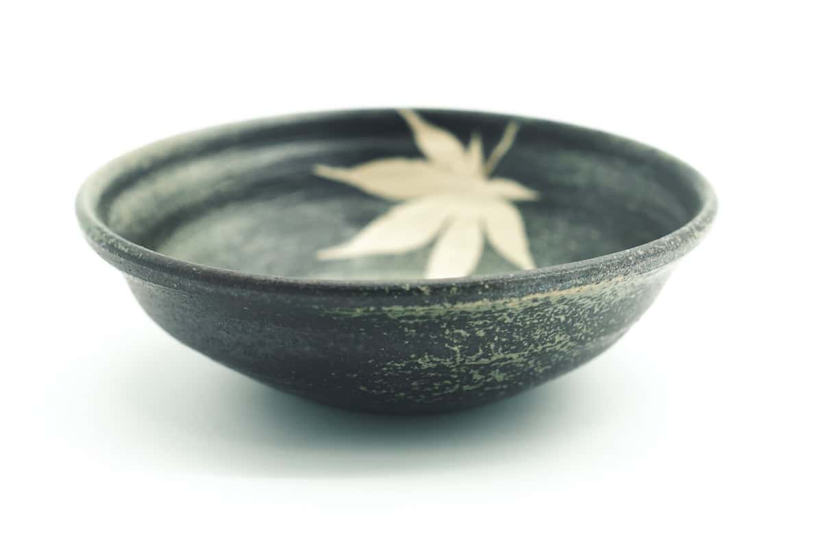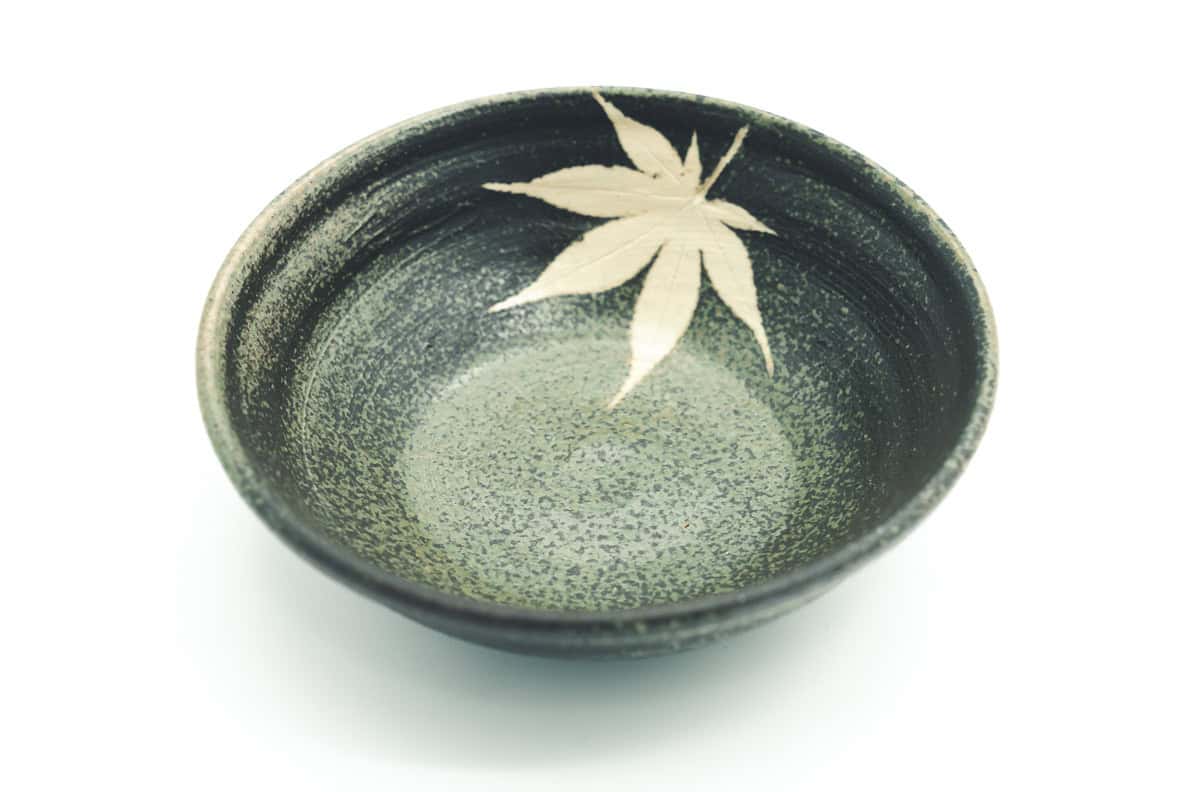 Ce modèle est décoré avec des feuilles d’érable cueillies dans le jardin de l’atelier Tsuganoyaki, ce qui fait que chaque pièce est unique. La douce teinte noire de l’émail est une couleur transmise dans l’atelier depuis plus de 30 ans.