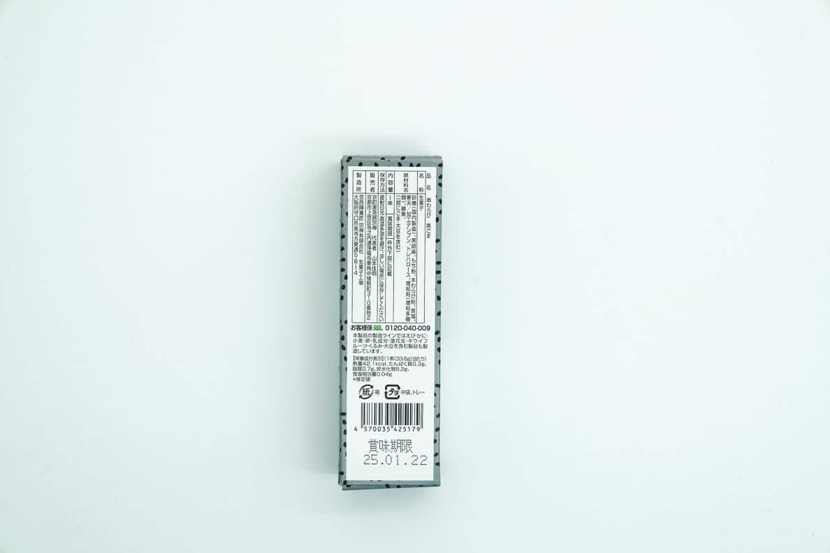 Sésame noir : Sucre fabriqué au Japon, sésame noir, farine de mochi (riz gluant), farine de fougère, sel, agar-agar / amidons modifiés,  tréhalose, épaississant (épaississant polysaccharidique), enzyme