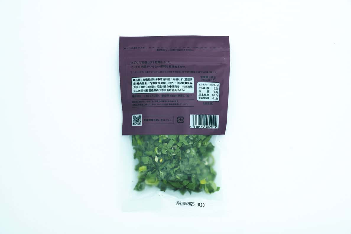 Voici de la ciboule verte (ou « negi ») cultivée sans pesticides ni engrais chimiques dans la préfecture d’Ehime, puis finement émincée et séchée. Ce petit sachet correspond à environ 70 g de ciboule fraîche. Au Japon, on accompagne souvent les nouilles ou les soupes avec de la ciboule verte. C’est un vrai second rôle incontournable de la cuisine japonaise !