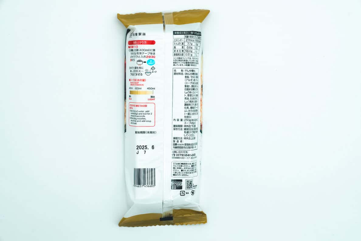 Ingrédients: [Nouilles] Farine de blé fabriquée au Japon, Sel / sel alcalin Kansui, épaississant (ester d’alginate), [Soupe]huile de colza fabriquée au Japon, Sel, sucre, hydrolysat de protéines, pâte de sésame, sauce soja, pâte d’ail, extrait de légumes, huile de cuisson aromatisée, poudre d’oignons, poudre de poivre, poudre de gingembre / Assaisonnement (acide aminé etc), émulsifiant, épaississant (gomme de guar), couleur de caramel, arôme